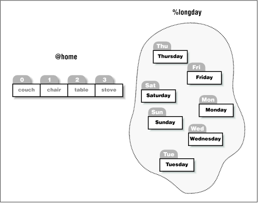A hash is an unordered set of scalars, accessed[8] by some string value that is associated with each scalar. For this reason hashes are often called associative arrays. But that's too long for lazy typists to type, and we talk about them so often that we decided to name them something short and snappy. The other reason we picked the name "hash" is to emphasize the fact that they're disordered. (They are, coincidentally, implemented internally using a hash-table lookup, which is why hashes are so fast, and stay so fast no matter how many values you put into them.) You can't push or pop a hash though, because it doesn't make sense. A hash has no beginning or end. Nevertheless, hashes are extremely powerful and useful. Until you start thinking in terms of hashes, you aren't really thinking in Perl. Figure 1-1 shows the ordered elements of an array and the unordered (but named) elements of a hash.