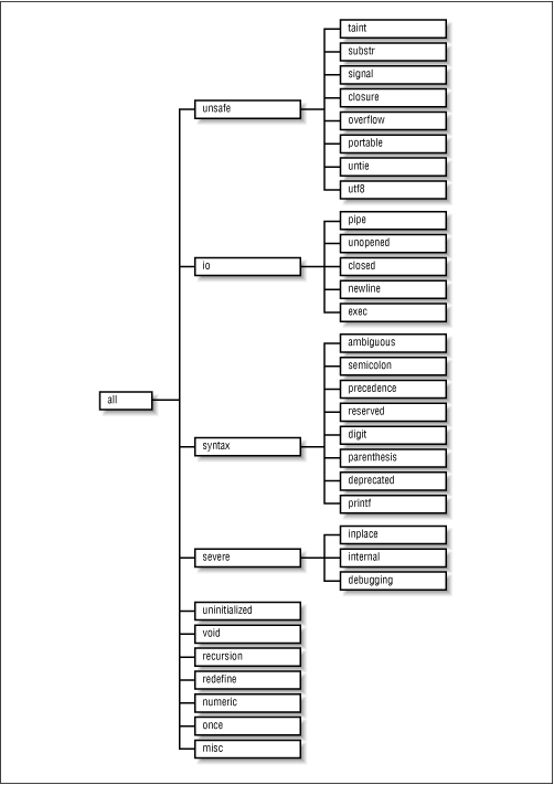 The warnings pragma circumvents these limitations by being a lexically scoped, compile-time mechanism that permits finer control over where warnings can or can't be triggered. A hierarchy of warning categories (see Figure 31-1) has been defined to allow groups of warnings to be enabled or disabled in isolation from one another. (The exact categorization is experimental and subject to change.) These categories can be combined by passing multiple arguments to use or no: